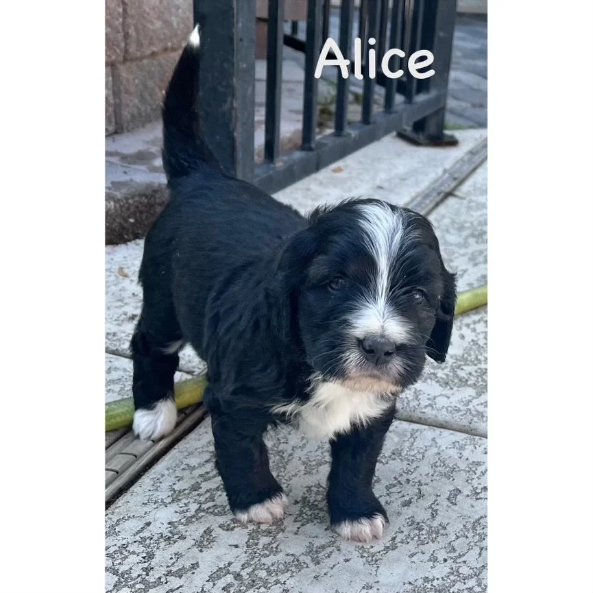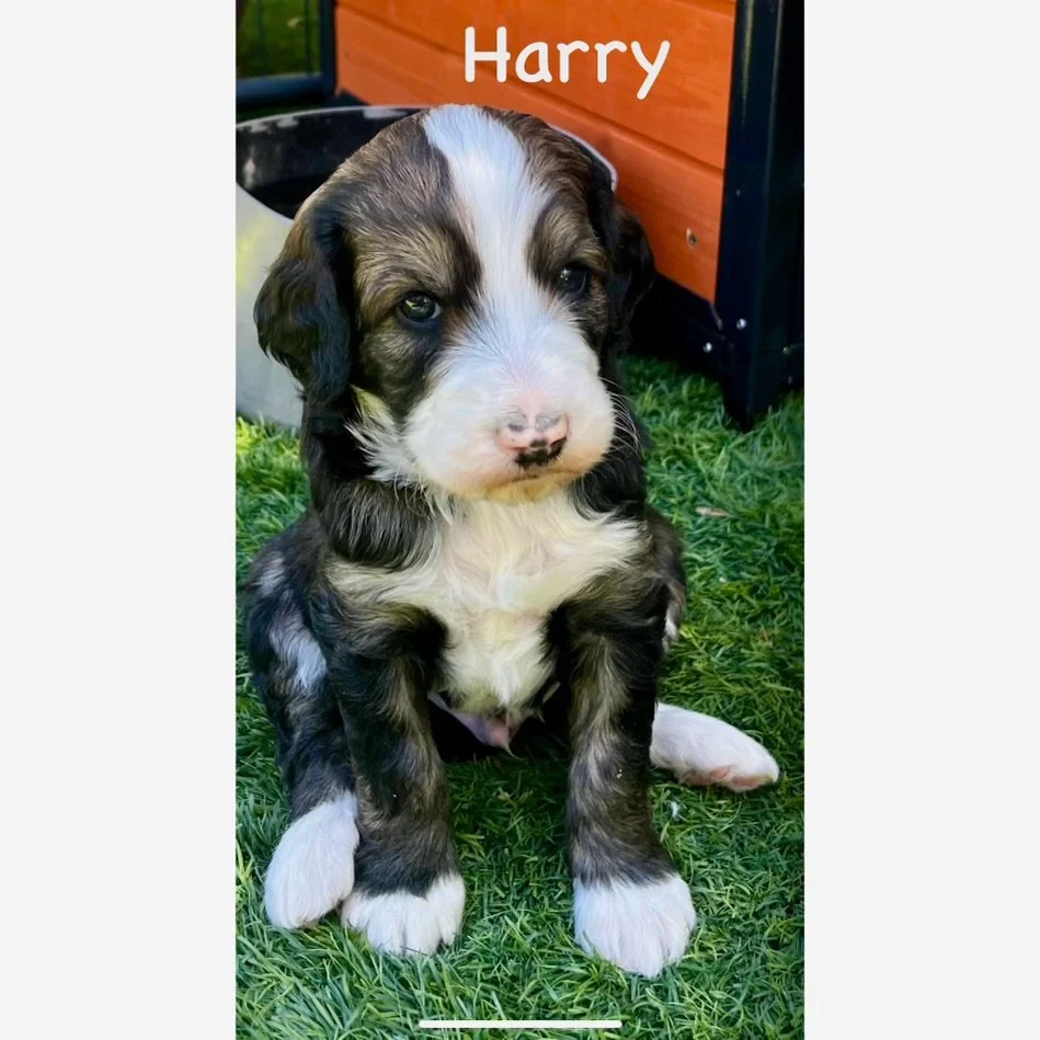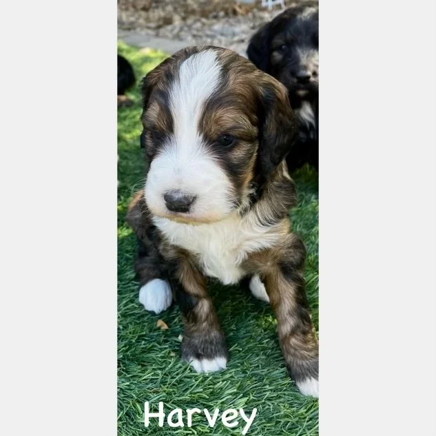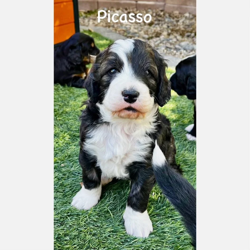 The mother, Roxie, is the product of a purebred brindle poodle from Logandale Nevada and our sweet stud Brutus an F1b Bernedoodle. She has a calm and loving disposition. She keeps herself and her puppies very clean. She always looks stately, and has taught her puppies to be very obedient. This is the first litter that has always stayed together in our puppy room when their mother was gone and they did not try to leave through the doggie door. She has been very attentive to their needs and now has appropriately started to self wean from her puppies. She sleeps with them every night and checks on them regularly throughout the day.